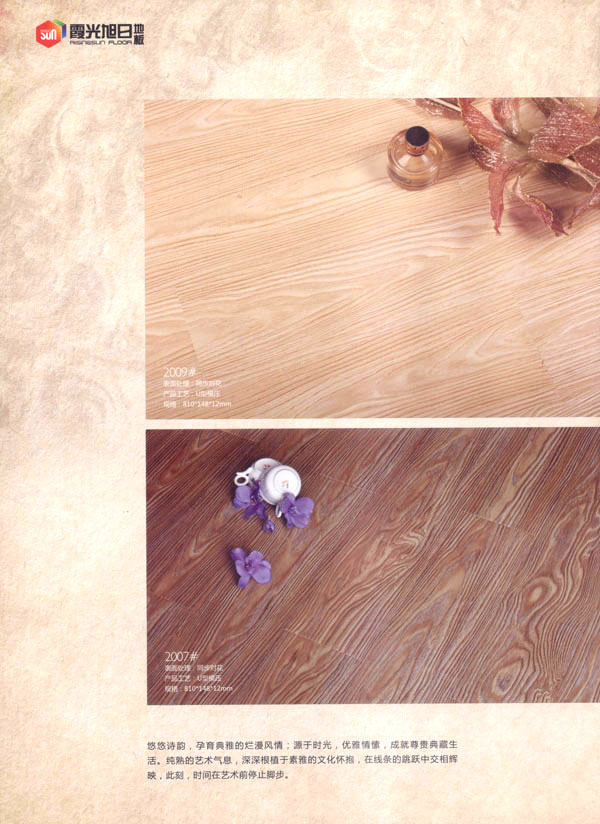 品牌保證,質(zhì)量放心 公司旗下“霞光.旭日”品牌地板系列由旭日皇家、旭日經(jīng)典、旭日戀家、至尊奢華、巧奪天工、水晶陶瓷等幾個(gè)系列構(gòu)成,配有專職質(zhì)量檢驗(yàn)人員,嚴(yán)把產(chǎn)品質(zhì)量關(guān),不斷完善產(chǎn)品質(zhì)量體系、監(jiān)控管理體系。公司對客戶需求全面、科學(xué)、準(zhǔn)確地把握,確保對客戶市場適時(shí)高效反應(yīng)。一流的設(shè)備、精心的選材、完美的工藝以及對產(chǎn)品品味不倦的追求,令奔公司產(chǎn)品獨(dú)樹一幟。