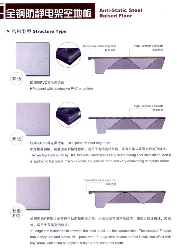 常州市蘇杰機(jī)房地板有限公司是高架地板專業(yè)制造商,專業(yè)從事防靜電地板、OA網(wǎng)絡(luò)地板等各種系列高架地板的研發(fā)、制造和銷售,并提供各種機(jī)房地面和智能化辦公區(qū)地面的整體解決方案。 公司廠區(qū)面積30000平方米,擁有全鋼地板生產(chǎn)線兩條,木基、硫酸鈣基地板生產(chǎn)線各一條,年綜合產(chǎn)能100萬平方米。生產(chǎn)蘇杰牌防靜電地板系列和蘇杰牌網(wǎng)絡(luò)地板系列,主要產(chǎn)品有全鋼防靜電架空地板、全鋼OA網(wǎng)絡(luò)地板、瓷磚貼面防靜電地板、硫酸鈣防靜電地板、木基防靜電地板、鋁合金防靜電地板、防靜電通風(fēng)地板等。 蘇杰人秉承“科技先導(dǎo)、市場(chǎng)為本、持續(xù)發(fā)展”的企業(yè)發(fā)展觀,堅(jiān)持“以先進(jìn)技術(shù)裝備為基礎(chǔ),以現(xiàn)代化管理為依托,以專業(yè)化服務(wù)為保障”的宗旨,使公司不斷發(fā)展壯大成為現(xiàn)代化的企業(yè)。 蘇杰人堅(jiān)持“嚴(yán)謹(jǐn)思考、嚴(yán)密操作、嚴(yán)格檢查、嚴(yán)肅驗(yàn)證”的品質(zhì)理念和“以客戶為中心”的服務(wù)理念,始終致力于產(chǎn)品的技術(shù)創(chuàng)新和質(zhì)量創(chuàng)優(yōu),為用戶提供優(yōu)質(zhì)的產(chǎn)品、合理的價(jià)格和貼心的服務(wù)。 常州市蘇杰機(jī)房地板有限公司將不斷開發(fā)和制造一流的產(chǎn)品,吸引和培養(yǎng)一流的人才,提供和完善一流的服務(wù),樹立和保持一流的形象,與時(shí)俱進(jìn),共謀發(fā)展。