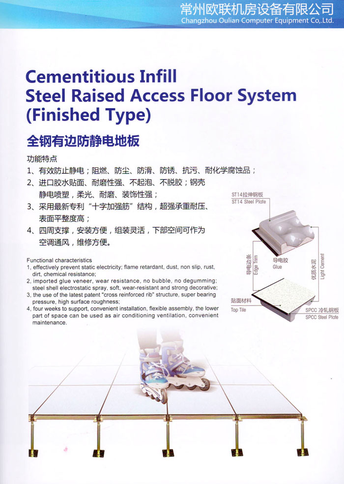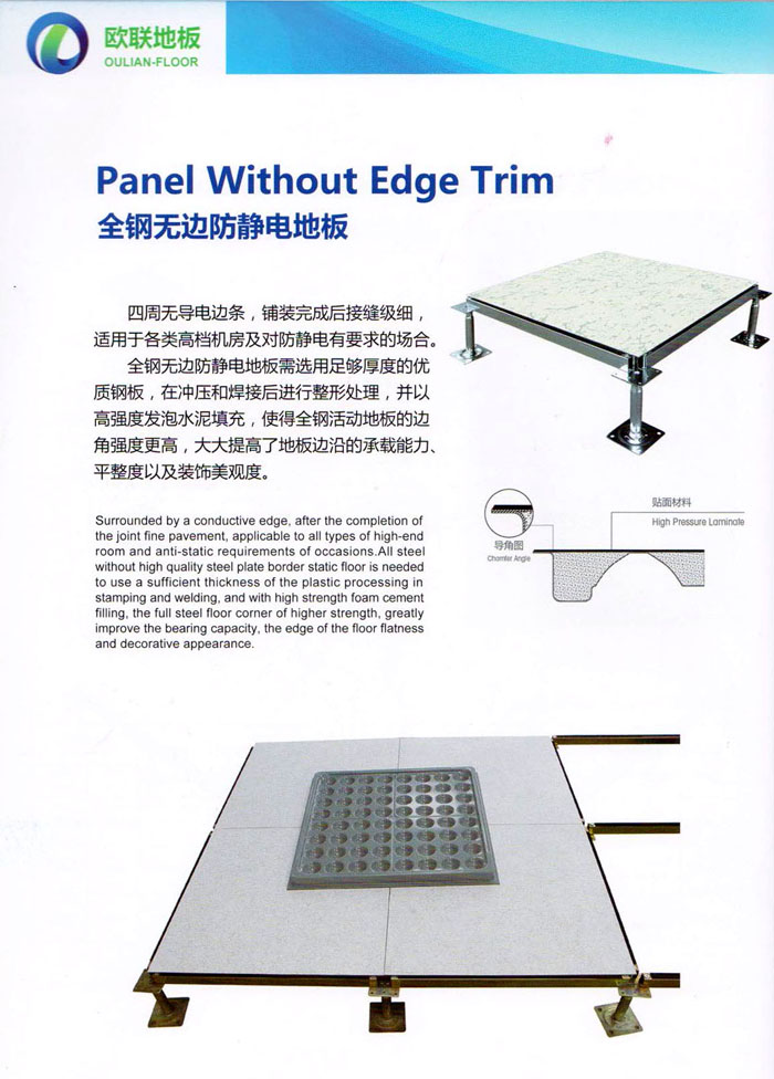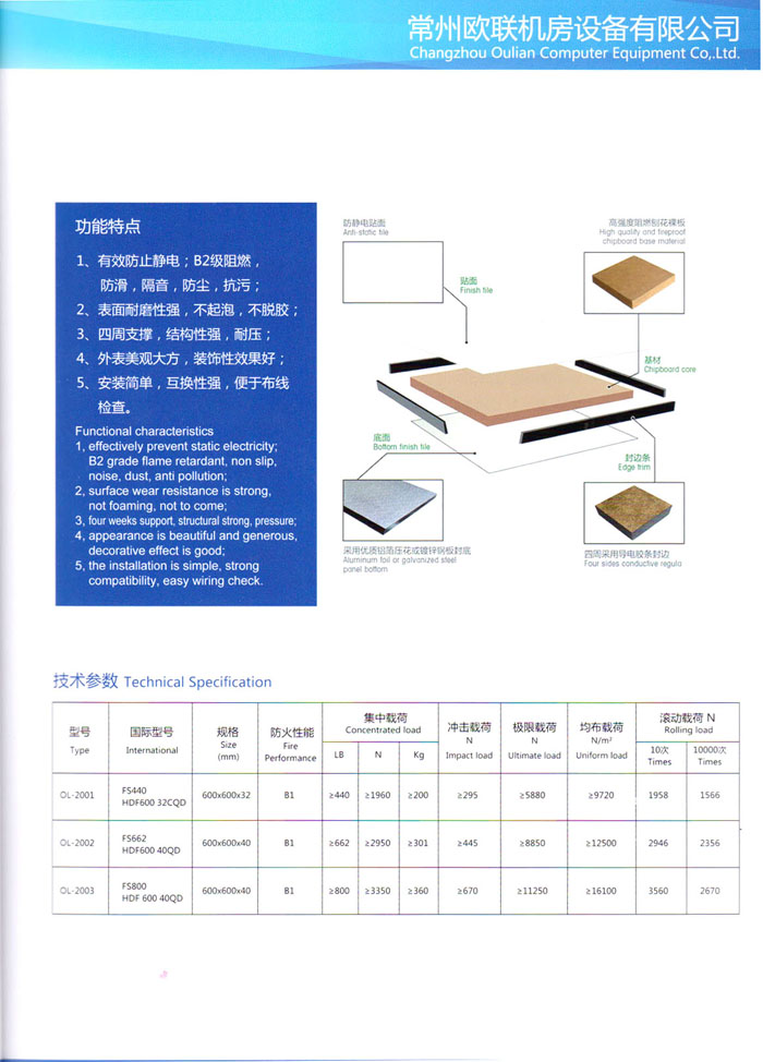 防靜電高架活動地板、全鋼地板、陶瓷地板是計算機行業(yè)發(fā)展起來的新型鋪地材料,隔離了潮氣、靜電灰塵,最重要的是解決了綜合布線問題,無需預埋管線,可隨時拆卸、搬移,保證了資訊設備完整的優(yōu)點,適應了智能化樓宇中信息自動化技術(shù)對所處環(huán)境的特定要求,避免了廣大客戶的雙重投資,使現(xiàn)代化辦公程度更加高效,辦公場所更加舒適。 “歐聯(lián)”系列全鋼地板,符合國家安全要求,種類完備多樣,其中防靜電陶瓷地板、硫酸鈣地板等除具有普通瓷質(zhì)的裝飾和實用性外,其耐磨、防水、防火功能優(yōu)于其它同類產(chǎn)品,防靜電系列地板,能切合不同客戶的要求,其靈活的配置,深受客戶歡迎,不同材質(zhì)的地板結(jié)構(gòu)使設計師的設計空間比傳統(tǒng)的更加廣闊自由和善變。 公司大力發(fā)展國內(nèi)外銷售業(yè)務,多次中標國內(nèi)重點工程 ,例:哈爾濱醫(yī)科大學、山東大學、上海普通機場等。 公司將一如既往開發(fā)和制造一流的產(chǎn)品,愿與廣大有識之士合作發(fā)展,共創(chuàng)美好未來。
