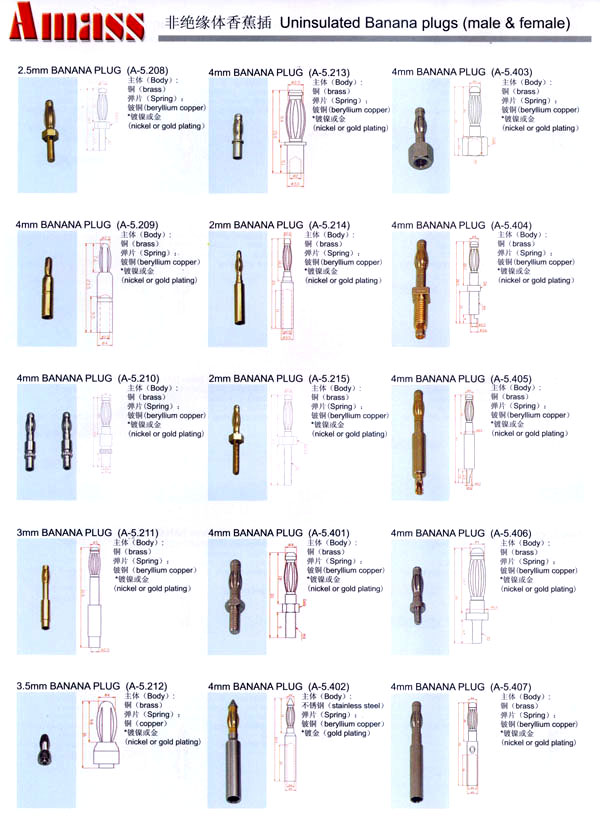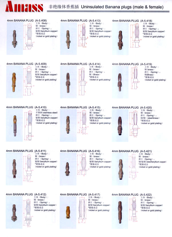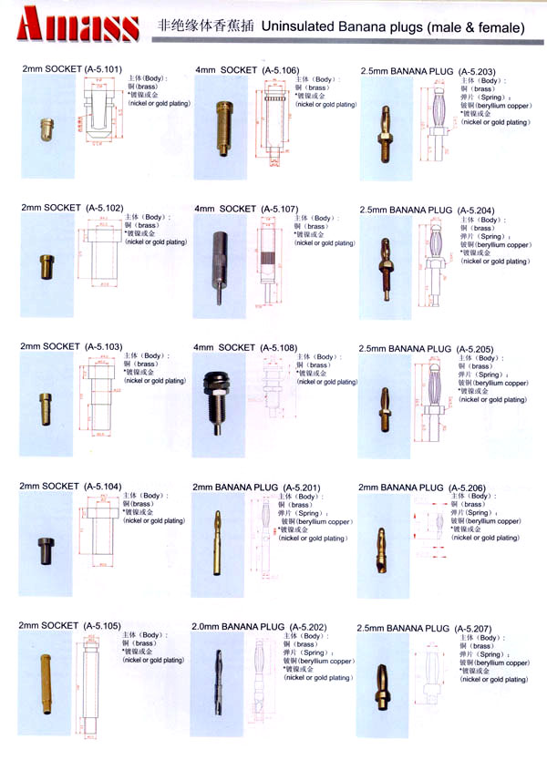 本公司專業(yè)生產(chǎn)各類香蕉插頭,香蕉插座,接線柱,電瓶夾,鱷魚夾,測試導(dǎo)線,測試筆等。產(chǎn)品分2mm/2.5mm/3mm/3.5mm/4mm五大系列,百余種款式, 各種香蕉插廣泛用于儀器、儀表、電力測試、教學(xué)、玩具,視聽設(shè)備、醫(yī)療儀器,保健產(chǎn)品等領(lǐng)域。公司技術(shù)力量雄厚,生產(chǎn)工藝先進,產(chǎn)品遠銷港、臺、歐美,并與飛利浦等國際品牌配套。公司本著精益求精的理念,歡迎新老客戶光臨。 我們擁有資深的工程師和豐富的電子產(chǎn)品銷售經(jīng)驗,專業(yè)生產(chǎn)各類電子接插件產(chǎn)品。 香蕉插頭,香蕉插座,電瓶夾,鱷魚夾等品種齊全、 質(zhì)量可靠,致力服務(wù)于通訊、數(shù)據(jù)通信、消費類電子產(chǎn)品、計算機和計算機外圍設(shè)備以及工業(yè)應(yīng)用等領(lǐng)域,能給客戶提供全面采購解決方案。 我們秉承穩(wěn)健作風(fēng)、誠實經(jīng)營、合理價格、完善服務(wù)的宗旨,在全體客戶的支持下,公司不斷創(chuàng)新進取,業(yè)績蒸蒸日上,已與數(shù)十家電子零件制造商及其分支機構(gòu)建立密切合作關(guān)系,在國內(nèi)擁有數(shù)百家固定客戶。