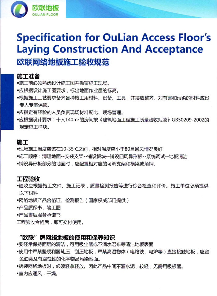 防靜電高架活動(dòng)地板、全鋼地板、陶瓷地板是計(jì)算機(jī)行業(yè)發(fā)展起來的新型鋪地材料,隔離了潮氣、靜電灰塵,最重要的是解決了綜合布線問題,無需預(yù)埋管線,可隨時(shí)拆卸、搬移,保證了資訊設(shè)備完整的優(yōu)點(diǎn),適應(yīng)了智能化樓宇中信息自動(dòng)化技術(shù)對(duì)所處環(huán)境的特定要求,避免了廣大客戶的雙重投資,使現(xiàn)代化辦公程度更加高效,辦公場(chǎng)所更加舒適。 “歐聯(lián)”系列全鋼地板,符合國家安全要求,種類完備多樣,其中防靜電陶瓷地板、硫酸鈣地板等除具有普通瓷質(zhì)的裝飾和實(shí)用性外,其耐磨、防水、防火功能優(yōu)于其它同類產(chǎn)品,防靜電系列地板,能切合不同客戶的要求,其靈活的配置,深受客戶歡迎,不同材質(zhì)的地板結(jié)構(gòu)使設(shè)計(jì)師的設(shè)計(jì)空間比傳統(tǒng)的更加廣闊自由和善變。 公司大力發(fā)展國內(nèi)外銷售業(yè)務(wù),多次中標(biāo)國內(nèi)重點(diǎn)工程 ,例:哈爾濱醫(yī)科大學(xué)、山東大學(xué)、上海普通機(jī)場(chǎng)等。 公司將一如既往開發(fā)和制造一流的產(chǎn)品,愿與廣大有識(shí)之士合作發(fā)展,共創(chuàng)美好未來。
